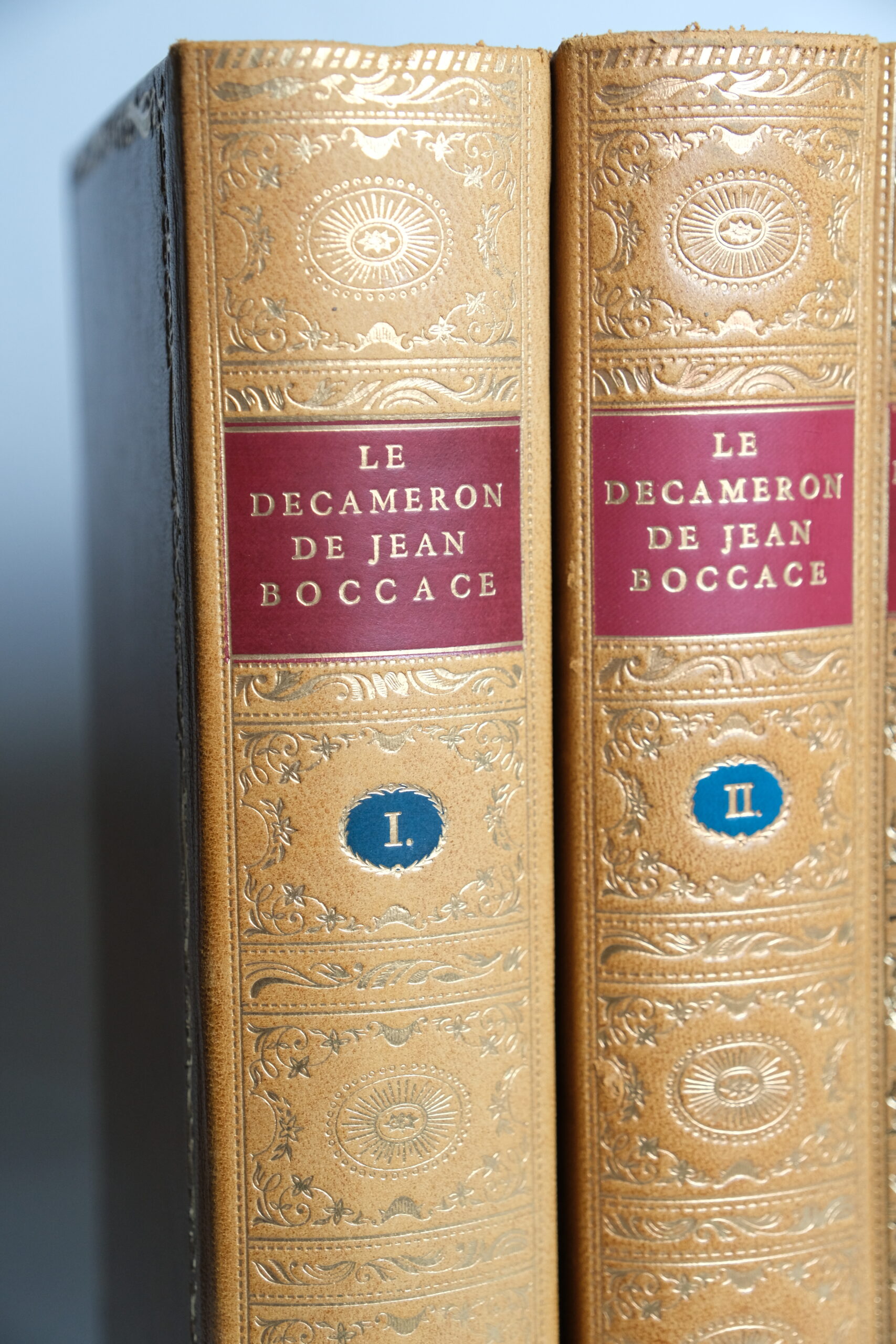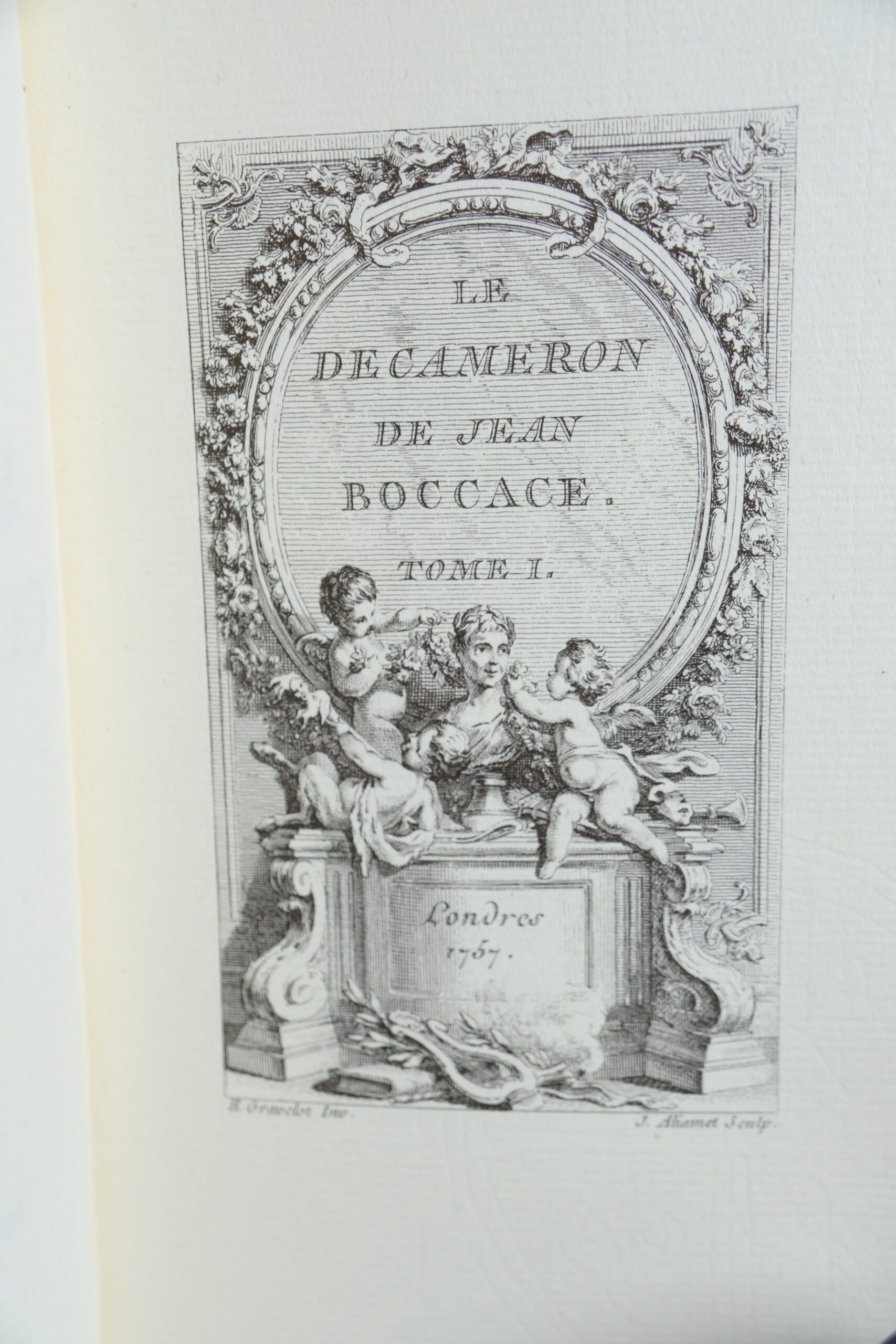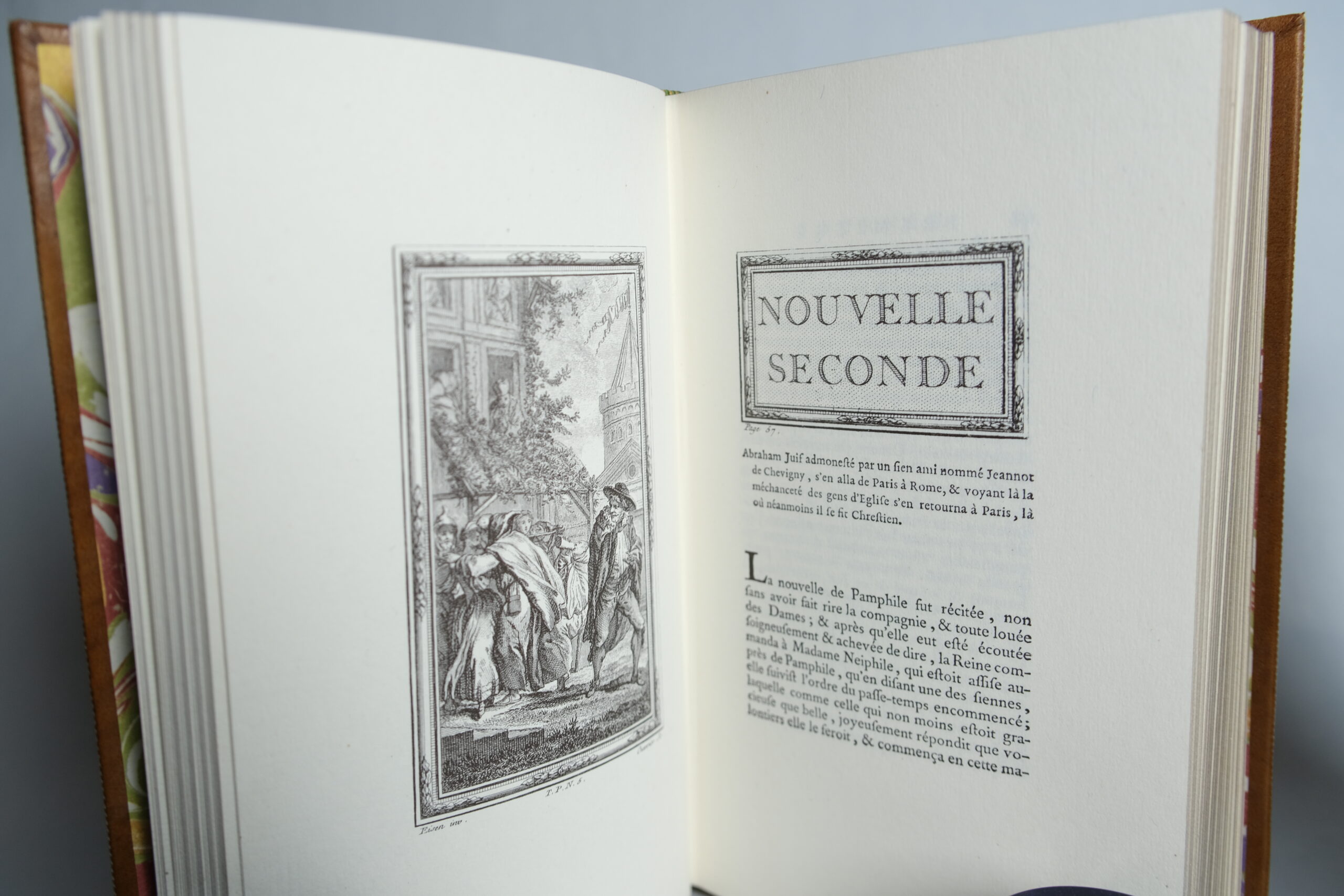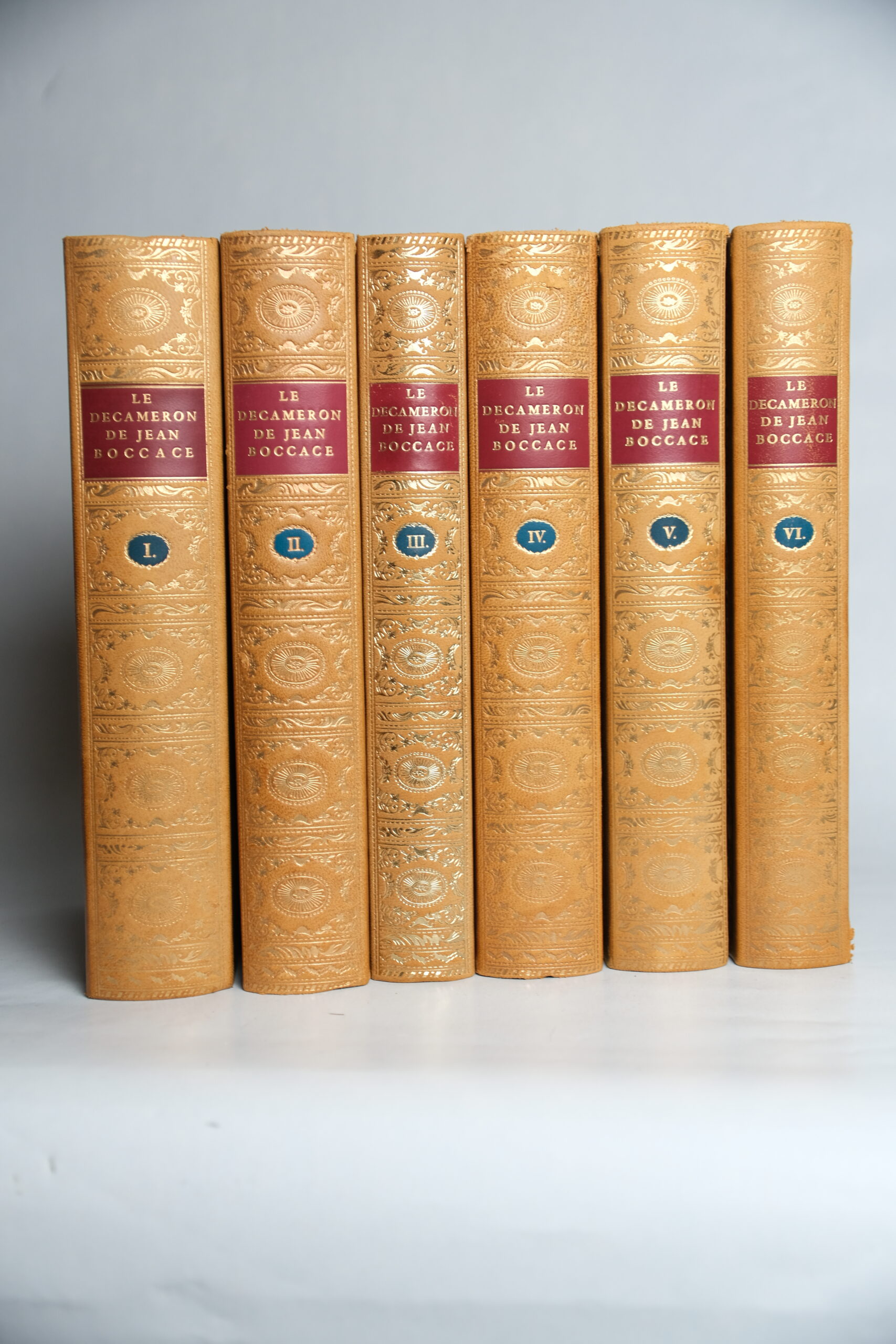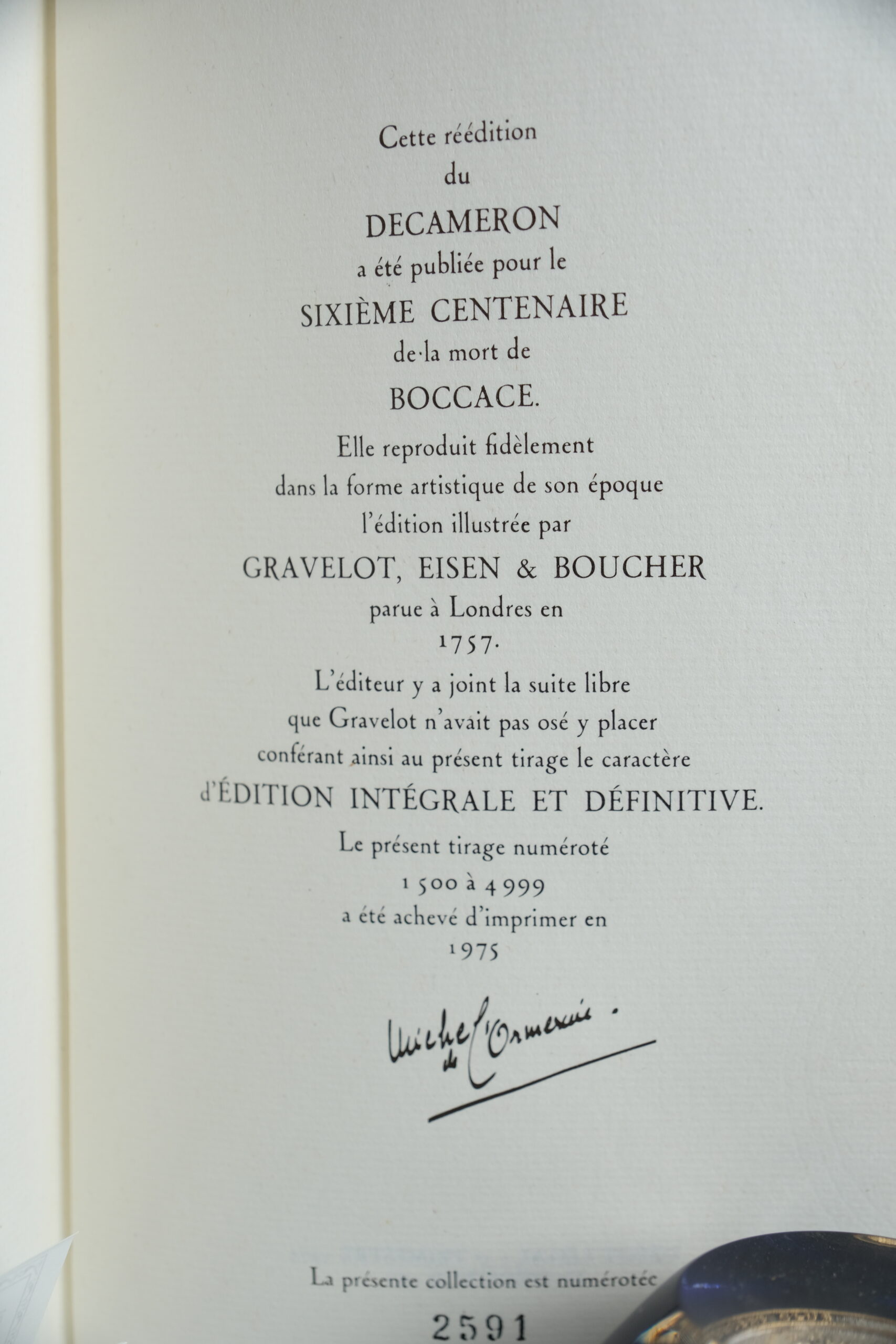 Tirage n°2591 / 4999. Édition pour le sixième centenaire de la mort de Boccace, reproduisant la forme de l’édition publiée à Londres en 1957, avec l’ajout, dans le sixième tome, de la suite libre de Gravelot (20 fig. déshabillées) qui ne furent pas publiées à l’époque pour leur caractère « libertin ».