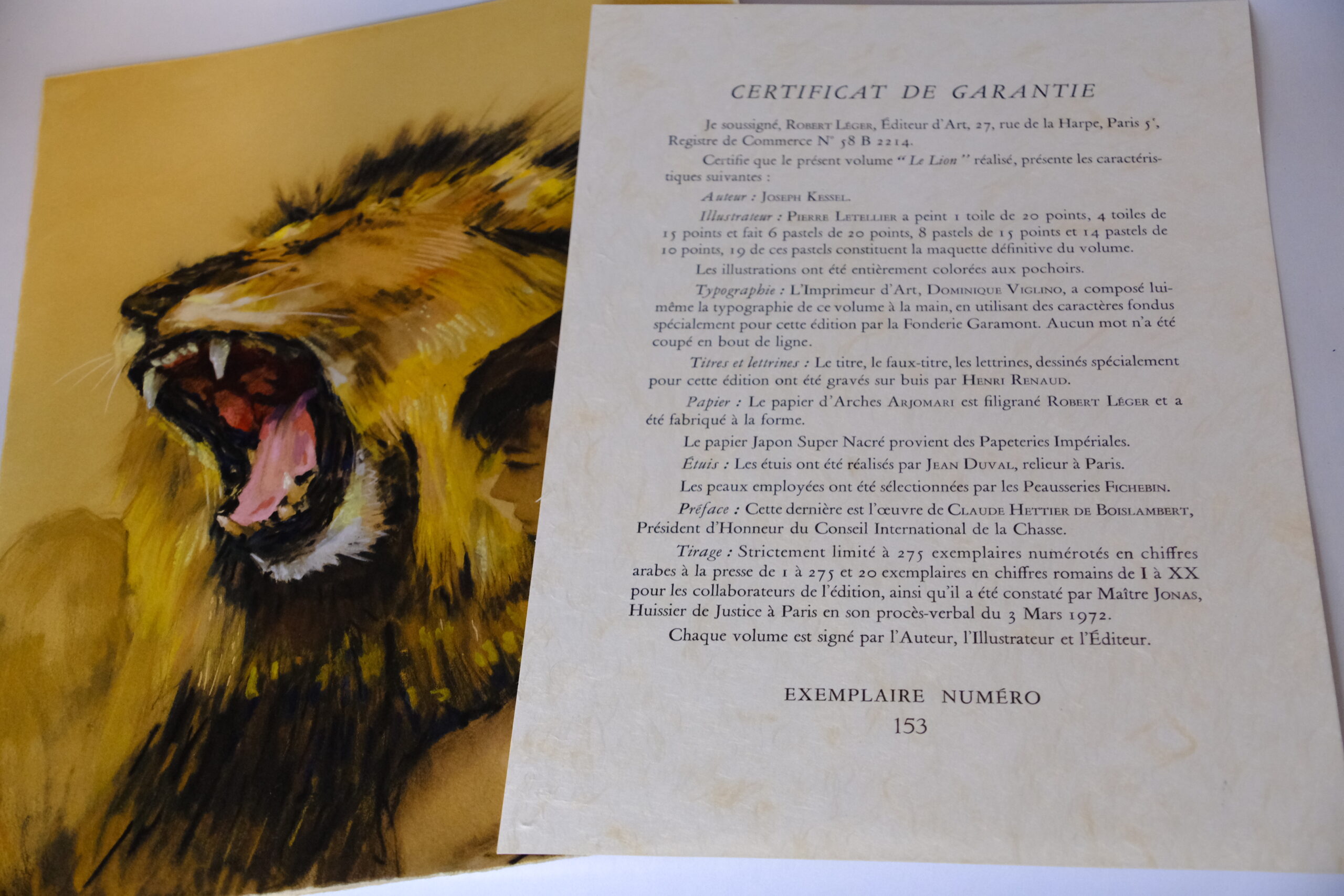 KESSEL (Joseph) – LETELLIER (Pierre), Le Lion. Paris, Robert Léger, 1972.