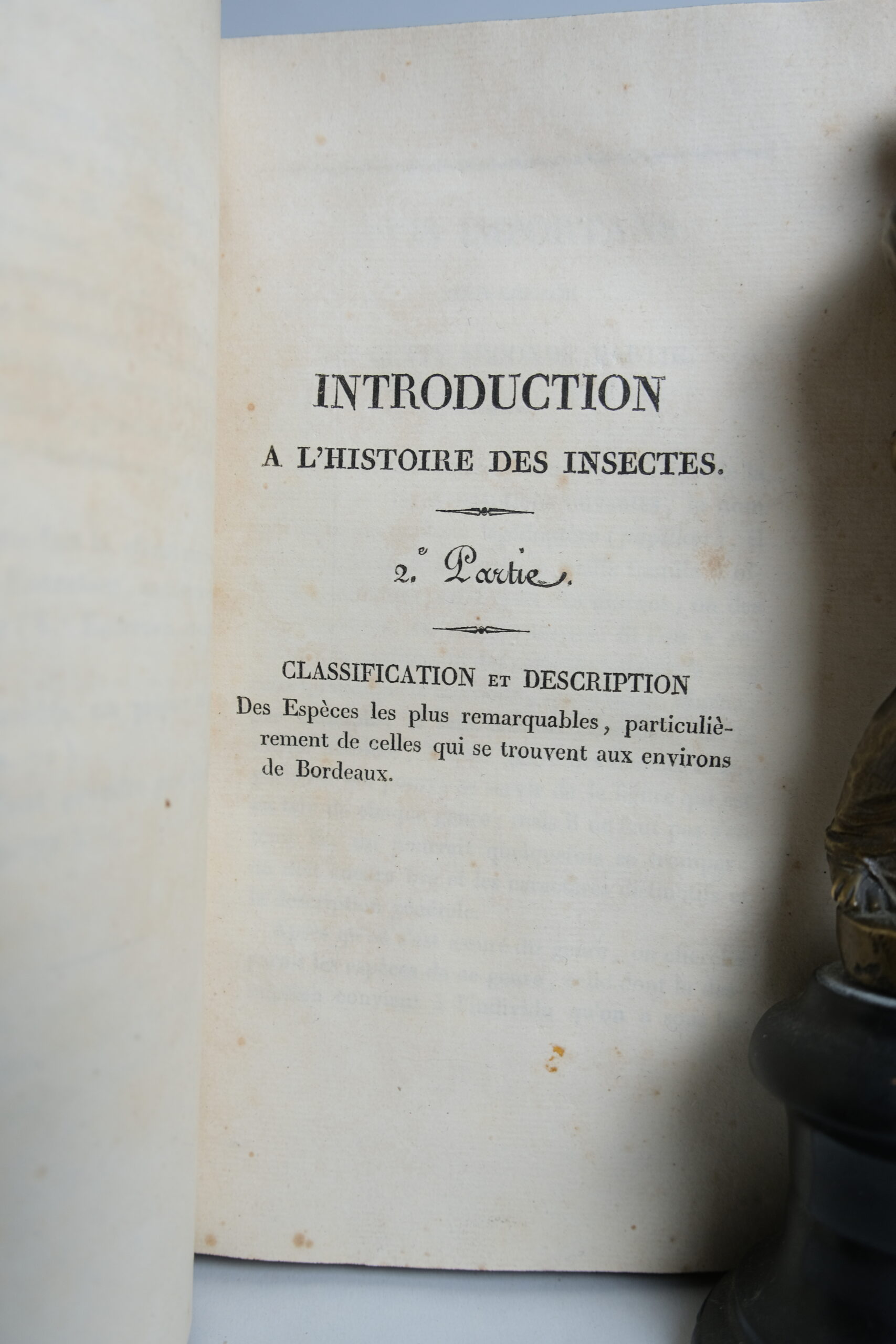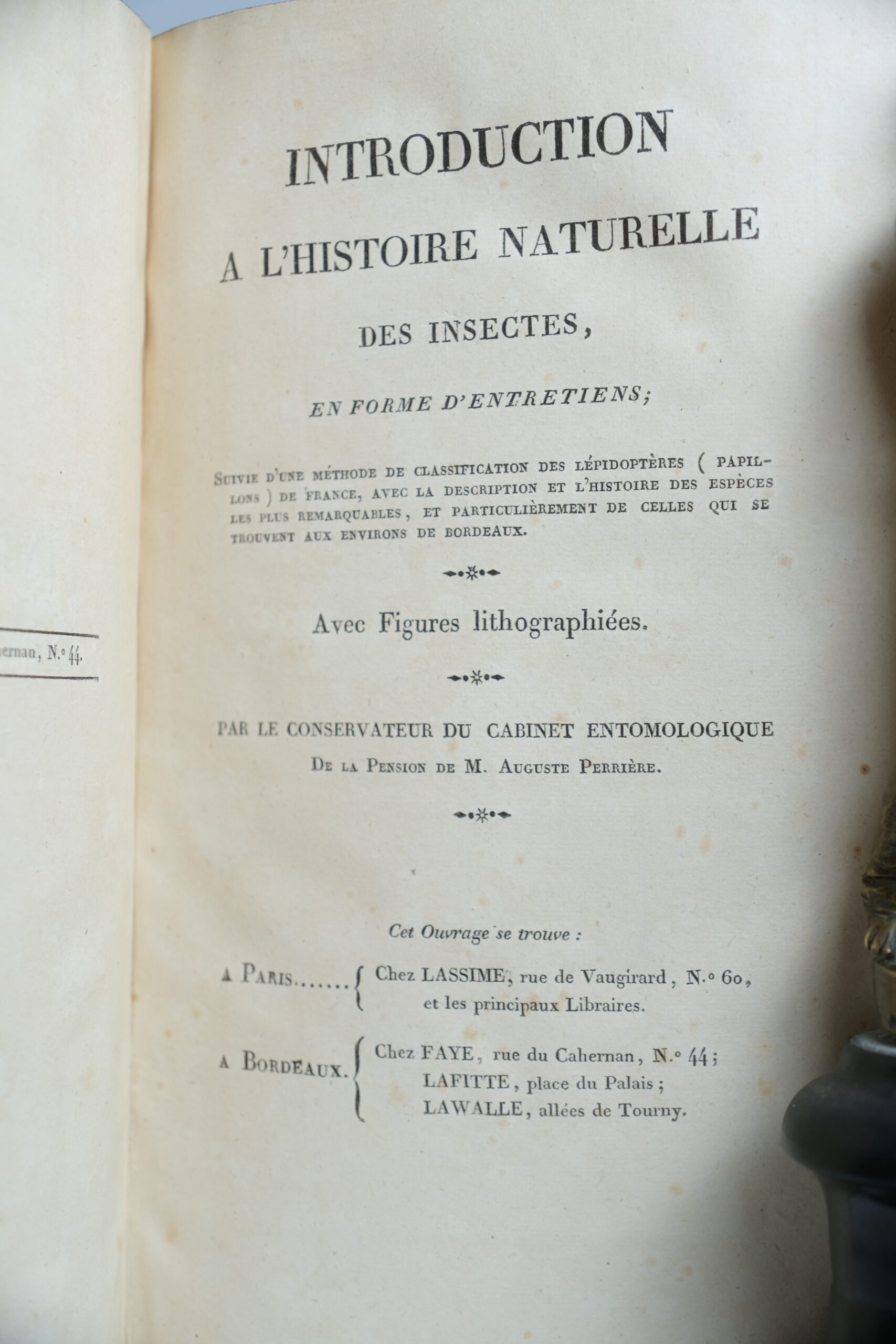 Titre complet : Introduction à l’histoire naturelle des insectes, en forme d’entretiens suivi d’une méthode de classification des lépidoptères (Papillons) de France, avec la description et l’histoire des espèces les plus remarquables, et particulièrement de celles qui se trouve aux environs de Bordeaux.